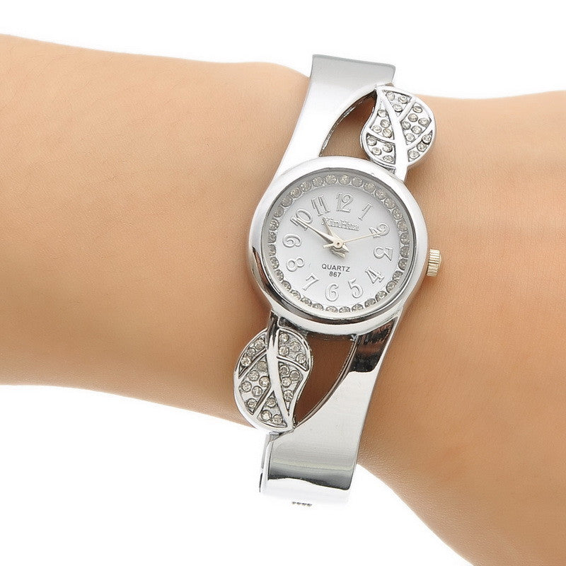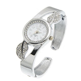 Fashion Student Children Cuff Bangle Watch Round Quartz Watch Women Dress Watch Gift Rhinestone Leaves Decor