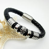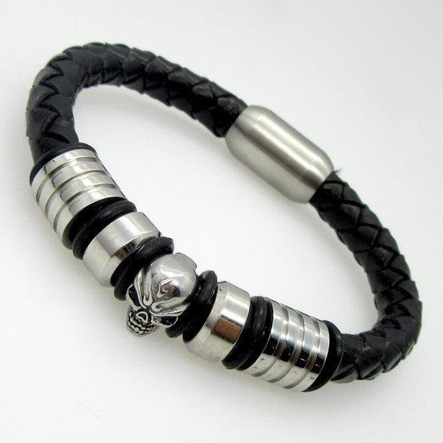 Men Jewelry Pirate Style Silver Genuine Leather Skull Bracelets Magnet Wholesale Cuff Braided Wrap Black