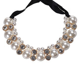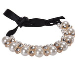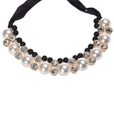 Diomedes Women Double Row Adjustable Band Ribbon Beads Rhinestone Necklace Imitation Pearl Chokers Necklaces Gift