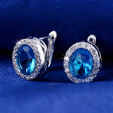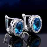 Fashion Platinum Plated Earring Stud with 3 ct Oval Cut Blue Zircon & Micro Paved Clear Zircon Women Earrings